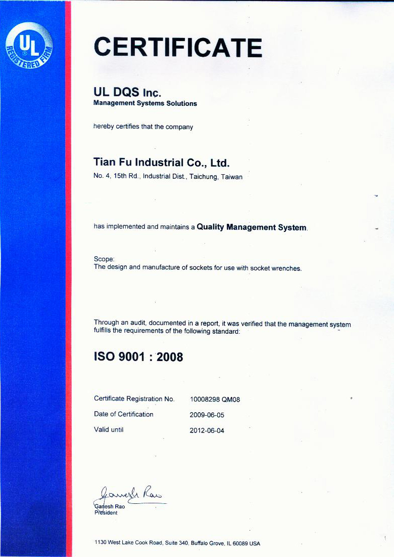 天賦工具通過了美國UL認(rèn)證,符合iso9001:2008的各項(xiàng)包括設(shè)計(jì)、制造、安裝和服務(wù)系統(tǒng)。